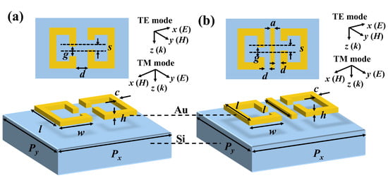 Figure 1 shows the schematic drawings of PSM_1 (Figure 1a) and PSM_2 (Figure 1b) unit cells and the corresponding denotations, respectively. The configuration of PSM_1 is two face-to-face SRRs, while that of PSM_2 is a CWR sandwiched by the two face-to-face SRRs. The propagation direction of the incident THz wave is set along the negative z-axis direction, whereas the electric (E) field and magnetic (H) field are set as the xy-plane. The incident transverse electric (TE) polarized light is defined as the E-field, set along the x-axis direction, and the H-field, set along the y-axis direction, named the TE mode. The incident transverse magnetic (TM) polarized light is defined as the E-field, set along the y-axis direction, and the H-field, set along the x-axis direction, named the TM mode. The incident THz wave is set as a plane wave propagating vertically to the PSM surface; the surface plasma resonances will then be generated between two face-to-face SRRs for PSM_1 and between the CWR sandwiched by the two face-to-face SRRs for PSM_2. The proposed PSMs are tailored by the Au layer with a thickness of 300 nm (h = 300 nm) on SOI substrates. The structural periods of the PSMs are denoted as Px and Py along the x- and y-axis directions, respectively, where Px = Py = 100 μm. The lengths and widths of the PSMs are denoted as l and w, respectively, where l = 60 μm and w = 27.5 μm. The line widths of the PSMs are kept constant at 5 μm (c = 5 μm). The gaps and the distances of the gap center of the face-to-face SRRs along the y-axis direction are defined as g and s, respectively. The distances between the two face-to-face SRRs and between the SRRs and the CWR along the x-axis direction for PSM_1 and PSM_2 are defined as d. The geometrical parameters of the CWR are the metallic line width (a) and length (l). The g, s, and d parameters of PSM_1 are kept constant at g = 5 μm, s = 0 μm, and d = 5 μm, respectively. The g, s, d, and a parameters of PSM_2 are kept constant at g = 5 μm, s = 0 μm, d = 2 μm, and a = 1 μm, respectively. First, the transmission spectra of the PSMs are explored under the incident THz wave. Then, for PSM_2, the a and d variations are changed synchronously to investigate their relationships to the transmission spectra, while the g and s parameters are kept as g = 5 μm and s = 0 μm, and the sum value of a and d is kept constant. Finally, the effect of the incident polarization angles at 0 degrees (TE mode) and 90 degrees (TM mode) for both PSM_1 and PSM_2 are compared and investigated. The optical properties of the proposed devices are simulated through Lumerical Solutions’ finite difference time domain (FDTD)-based simulations. The propagation direction of incident light is set to be perpendicular to the x-y plane in the numerical simulations. Periodic boundary conditions are also adopted in the x and y directions, and perfectly matched layer (PML) boundary conditions are assumed in the z direction. The transmission of the incident THz wave is calculated by a monitor set under the bottom side of the proposed PSMs.