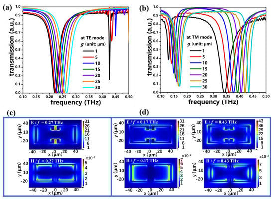 Figure 2a,b show the transmission spectra of PSM_1 by changing the g value from 1 μm to 30 μm at the TE and TM modes, respectively, while s and d are kept as s = 0 μm, d = 5 μm. The electromagnetic response exhibits single-resonance at TE mode and dual-resonance at TM mode. These two different responses show the polarization dependence of PSM_1. At the TE mode, the resonant intensity is almost kept constant, whereas the resonant frequency is blue-shifted from 0.22 THz to 0.27 THz by increasing the g value. The tuning range is 50 GHz. For a resonance larger than 0.40 THz, the resonant frequency is blue-shifted with the decreasing resonant intensity. When g is larger than 15 μm, there is no resonance. At the TM mode, there are two resonances blue-shifted from 0.13 THz to 0.17 THz (the first resonance) and from 0.34 THz to 0.44 THz (the second resonance). In order to better interpret the physical mechanism of this phenomenon, the corresponding E- and H-field distributions of PSM_1 at the TE and TM modes under the condition of g = 30 μm are presented in Figure 2c,d, respectively. At the TE mode, the E-field is accumulated in the adjacent parts of the two face-to-face SRRs, and the H-field is distributed around the upper and lower conductor bars of the SRRs. It generates a typical localized surface plasmon (LSP) resonance at 0.27 THz []. Figure 2d indicates the electromagnetic field distributions of these two different resonances, which contribute to the two LSP resonances at 0.17 THz and 0.43 THz. The E-fields are distributed around the gap of each SRR at 0.17 THz (the first resonance) and 0.43 THz (the second resonance), whereas the H-fields are distributed around the left and right conductor bars of the structure at 0.17 THz and around the contours of both SRRs at 0.43 THz.