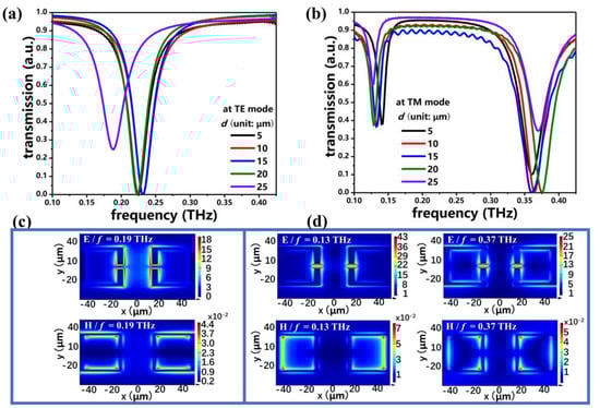 The transmission spectra of PSM_1, obtained by changing the d value and simultaneously keeping s = 0 μm and g = 5 μm at the TE and TM modes, are shown in Figure 3a,b, respectively. At the TE mode, the resonances are first blue-shifted from 0.22 THz to 0.25 THz when d increases from 5 μm to 15 μm, and then the resonances are red-shifted from 0.24 THz to 0.19 THz when d increases from 15 μm to 25 μm. At the TM mode, there are two resonances at 0.14 THz and 0.36 THz, and both resonances are slight variations of the resonant frequency and intensity, obtained by changing the d value. This indicates that the proposed PSM_1 exhibits the polarization-dependence characteristic. The electromagnetic characteristics of PSM_1 can be switched from single-resonance to dual-resonance by changing the polarization mode from TE to TM. These results could be explained by the corresponding E- and H-field distributions at the TE and TM modes, as shown in Figure 3c,d, respectively. It is obvious that the electromagnetic field distributions of PSM_1 with d = 25 μm are similar to those with g = 30 μm, which are shown in Figure 2c,d. Therefore, the resonances of 0.19 THz at the TE mode and the resonances of 0.13 THz and 0.37 THz at the TM mode are LSP resonances.