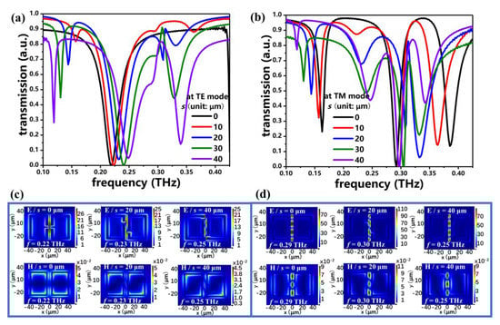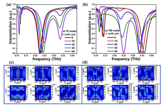 Figure 6a,b show the transmission spectra of PSM_2 by changing the s value from 0 μm to 40 μm at the TE and TM modes, respectively. The g, d, and a values are kept as g = 5 μm, d = 2 μm, and a = 1 μm. Evidently, the transmission spectra of PSM_2 by changing the s value at the TE mode shown in Figure 6a are similar to those of PSM_1 shown in Figure 4a. It can be explained by the E- and H-field distributions of PSM_2 in Figure 6c. It is obvious that the electromagnetic field distributions of PSM_2 at the TE mode are similar to those of PSM_1, shown in Figure 4c. Therefore, the resonances of 0.22 THz, 0.23 THz, and 0.25 THz at the TE mode are LSP resonances. At the TM mode, there are three resonances, at 0.16 THz, 0.29 THz, and 0.39 THz, at the initial state (s = 0 μm). By increasing the s value, the PSM_2 device can be switched from triple-resonance to quad-resonance. The E- and H-field distributions of PSM_2 with s = 0 μm, 20 μm, and 40 μm at the TM mode are summarized in Figure 6d. The electromagnetic fields are gathered in the CWR and are quite different from those of PSM_1, which are shown in Figure 4d. This causes the difference in the transmission spectra between PSM_1 and PSM_2 at the TM mode. It indicates that the LSP resonances of 0.29 THz for s = 0 μm, 0.30 THz for s = 20 μm, and 0.40 THz for s = 40 μm are generated by the CWR.