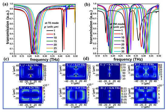 Transmission spectra of PSM_1 with different g values at the (a) TE and (b) TM modes. Here, (c) and (d) are the corresponding E-field and H-field distributions of PSM_1, with g = 30 μm at TE and TM modes, respectively (f is the monitored frequency).