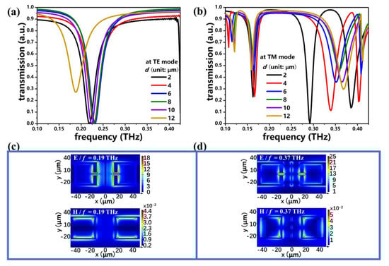 The transmission spectra of PSM_2 obtained by changing the d value and simultaneously keeping g = 5 μm, s = 0 μm, and a = 1 μm at the TE and TM modes are shown in Figure 7a,b, respectively. The electromagnetic responses indicate that the PSM_2 with different d values shows polarization-sensitivity. At the TE mode, the resonances are first blue-shifted from 0.22 THz to 0.24 THz when d increases from 2 μm to 8 μm, and they are then red-shifted from 0.24 THz to 0.19 THz when d increases from 8 μm to 12 μm. At the TM mode, there are three resonances: one is around the resonant frequency of 0.16 THz, one is blue-shifted from 0.29 THz to 0.37 THz, and the other is blue-shifted from 0.39 THz to 0.42 THz by increasing the d value. A resonance will be generated at 0.11 THz when d is 4 μm. By increasing the d value, this resonance is blue-shifted and the corresponding resonant intensity is larger. The corresponding E- and H-field distributions of PSM_2 with d = 12 μm at the TE and TM modes are shown in Figure 7c,d, respectively. The corresponding resonant frequencies are 0.19 THz at the TE mode and 0.37 THz at the TM mode. Compared with the electromagnetic field distributions of PSM_1 with d = 25 μm at 0.19 THz (at the TE mode) and 0.37 THz (at the TM mode) shown in Figure 3c,d, the E- and H-field distributions of PSM_2 with d = 12 μm indicate the influence of the CWR. It is obvious that the coupling effect generated by the CWR becomes weaker with the larger distance between the CWR and the SRRs. Therefore, the LSP resonances of 0.19 THz at the TE mode and 0.37 THz at the TM mode are generated by the SRRs.