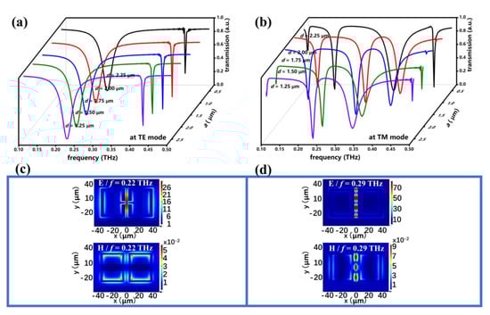 Transmission spectra of PSM_1 with different d values at the (a) TE and (b) TM modes. Here, (c) and (d) are the corresponding E-field and H-field distributions of PSM_1 with d = 25 μm at TE and TM modes, respectively (f is the monitored frequency).