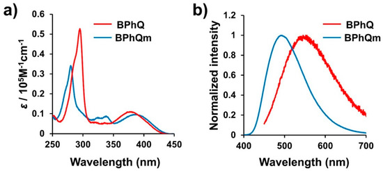 (a) UV–vis absorption and (b) photoluminescence spectra of BPhQ and BPhQm (1.0 × 10−5 M chloroform solution).
