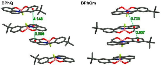 We evaluated the emission efficiencies of the complexes in the solution, aggregation, and crystalline samples (Table 1 and Figures S13–S14, See Supplementary Materials). From a comparison with the emissive properties in the solution and solid form, it was found that BPhQ and BPhQm showed opposite behaviors: BPhQ had AIE and CIE characteristics, while BPhQm showed typical ACQ. We prepared aggregated samples of BPhQ and BPhQm from THF/H2O solutions with a water fraction of 99%, and the emission efficiencies were determined as the absolute fluorescence quantum efficiencies (ΦF). The ΦF values of the aggregation and crystalline sample for BPhQ were significantly higher than those of the solutions (ΦF,sol. = 0.008 → ΦF,agg. = 0.014, ΦF,cry. = 0.017). On the other hand, the ΦF values of the aggregated and crystalline sample for BPhQm were lower than those of the solution state (ΦF,sol. = 0.21 → ΦF,agg. = 0.072, ΦF,cry. = 0.051). The reduction in the ΦFs in the solid of BPhQm is likely to be caused by non-specific intermolecular interaction in the condensed state, followed by ACQ.