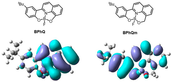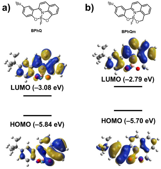 To examine in detail the photophysical processes especially in BPhQ, the radiative (kr) and non-radiative rate constants (knr)—which represent the sum of the rates in each process with or without emission, respectively—were determined from the lifetime measurements (Table 2 and Figure S15, See Supplementary Materials). Accordingly, it was found that BPhQ had a smaller kr and larger knr than BPhQm in solution, meaning that both the radiative and non-radiative processes should be quite different between BPhQ and BPhQm. In addition, the knrs of BPhQ in the aggregated and crystalline samples were lowered from those of the solution state, suggesting that the nonradiative decay channels related to the intramolecular motion of BPhQ in the solution state were efficiently restricted under rigid environments, such as in the aggregation and crystal. A similar enhancement of ΦF was also observed in 1 wt% polystyrene dispersed film (Table 2 and Figure S15, See Supplementary Materials). The ΦF of BPhQ in the polystyrene film was determined as 0.021, which is higher than that of the solution state (ΦF = 0.008), whereas it was found that the knr in the polystyrene film was one order lower than that in the solution state, representing that the improvement of the emission property in film should be associated with the restriction of molecular motions by polymer chains. Contrary to BPhQ, the ΦF of BPhQm decreased in the polystyrene film compared with that in the solution, and both of the knr values were in the same range, suggesting that the molecular motions of BPhQm in the excited state hardly play a role in the emission properties of the solution state because of its rigid molecular structure. In summary, from the comparison with both complexes, it was figured out that BPhQ had a larger non-radiative rate constant. Possibly, the distorted structure in BPhQ induced by boron complexation may cause geometrical perturbation in the excited state, and thus the molecular motions promoted non-radiative decay processes.