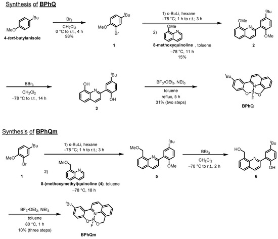 According to Scheme 1, the quinoline-based boron complex BPhQ was synthesized from the tridentate quinoline ligand 3 (Figures S1–S6 and Schemes S1–S3, See Supplementary Materials). The skeletal distortion was introduced into the quinoline scaffold by the formation of a five-membered ring with a four-coordinating boron atom. We also synthesized the methylene-inserted quinoline boron complex BPhQm as the planar molecule (Figures S7–S9 and Scheme S4, See Supplementary Materials). In the case of BPhQm, the double six-membered ring systems were formed by a boron complexation reaction for releasing distortion. To improve the solubility and inhibit undesired aggregation in the solution, BPhQ and BPhQm were modified with tert-butyl groups. Indeed, the synthesized complexes have good solubility in common organic solvents such as chloroform, THF, and dichloromethane. The structures of BPhQ and BPhQm were confirmed by 1H, 11B, 13C NMR, ionization mass measurements and elemental analyses. Fortunately, we obtained single crystals of the complexes suitable for X-ray analyses.