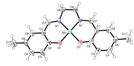 From the single crystal X-ray diffraction analysis we found that the compounds NiMesalen and NiMeOsalen of NiII were polymorphs of (2,2’-(ethane-1,2-diylbis((nitrilo)methylylidene))bis(4-methylphenolato))-nickel(II) methanol solvate [35] and dinuclear bis(2,2’-(ethane-1,2-diylbis((nitrilo)methylylidene))bis(4-methoxyphenolato))-di-nickel(II) methanol solvate [35], respectively. Polymorphism was found in the crystalline arrangement, since the compound NiMesalen (Figure 1) crystallized in the monoclinic crystal system with a space group of C2/c, while in literature it was found that methanol solvated compound crystallized in the triclinic crystal system with a space group of P-1. On the other hand, NiMeOsalen crystallized in the monoclinic crystal system with a space group of P21/c, while the previously reported methanol solvated compound was space group P21/n and monoclinic crystal system [35].