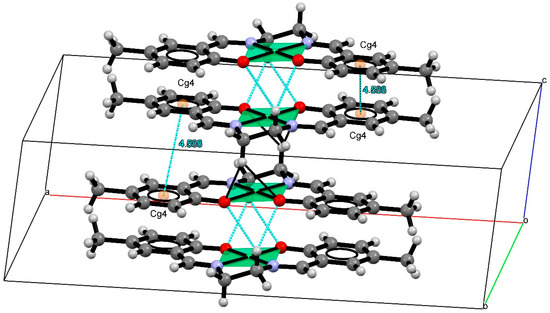 In the crystalline structure NiOHsalen, two interactions of π-π were shown. However, the -OH groups in the structure stabilized the crystalline packing mainly by the interaction of the hydrogen bridges for the Osolvent-H∙∙∙Osalen and Osalen-H∙∙∙Osolvent with methanol molecules [44]. The Ni-Ni distance was 3.61 Å, which, when compared to NiMeOsalen (3.18 Å), increased because of the sovlent’s role in the packing. One methanol molecule formed a hydrogen bridge interaction with two neighboring molecules, Osolvent-H∙∙∙Osalen and Osalen-H∙∙∙Osolvent [44]. These solvent interactions also occurred in the Nisalen structure when methanol was the solvate [33].