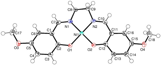 Figure 3 shows the perspective view of the molecular structure of polymorphic compound NiMeOsalen. The NiMeOsalen discrete unit contained one central NiII ion and one 2,2′-(ethane-1,2-diylbis((nitrilo)methylylidene))bis(4-methoxyphenolato) tetradentate ligand. The NiII ion was tetracoordinated with an N2O2 coordination environment. All bond length and angles corresponded to those reported in the literature [43]. Selected bond and angles parameters are given in Table 3.