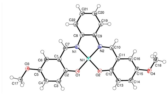 The compound NiMeOsalphen crystallized in a monoclinic crystal system with the space group P21/n. The asymmetric unit consisted of one nickel(II) center and one 2,2′-{1,2-phenylenebis[(azanylylidene)methylylidene]}bis(4-methoxyphenolato) ligand. The ORTEP diagram is shown in Figure 5. The squared plane of NiII center was chelated by two oxygen and two nitrogen atoms that derived from a salen ligand, with Ni-O and Ni-N bond distances ranging from 1.8394 to 1.8643 (13) Å. O-Ni-O, N-Ni-N, and O-Ni-N bond angles of 84.12 to 179.34°. The length distance of Ni-N was, on average, 1.8634(12) Å (Table 3), which was slightly higher than that observed in compounds NiMesalen and NiMeOsalen. Nevertheless, the tetracoordinate NiII in compound NiMeOsalphen had a square plane geometry with a rms of 0.0147 and a τ4 of 0.020. An analysis of the coplanarity shows that there were angles of 3.07 (7) and 5.06 (7)° between the square plane N2O2 at the metal center. The planes formed by the six-membered rings C1/C6 and C11/C16, respectively. Additionally, there was a perfect coplanarity between the square plane N2O2 at the metal center and the ring formed by the C8-C9-C1 /C22 atoms with an angle of 0.52 (7)°.