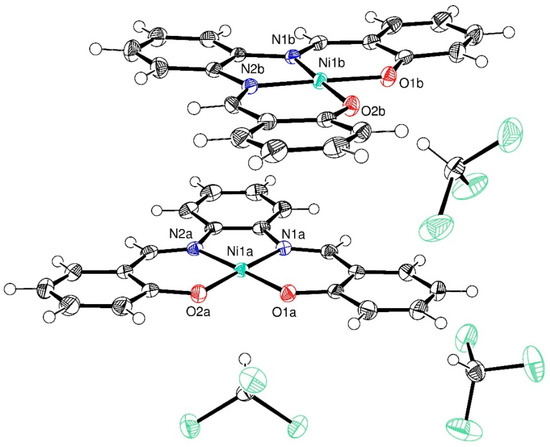 Unlike previously mentioned compounds NiMesalen, NiMeOsalen, and NiMeOsalphen, the single crystal X-ray diffraction analysis revealed that compound Nisalphen crystalized in the triclinic space group P-1. The asymmetric unit of Nisalphen contained two molecules of the nickel coordination compound and three molecules of the chloroform, which was then used as a solvent (Figure 7). Each metal central of NiII ion was tetracoordinated with one unit of a deprotonated salphen ligand with salphen = N,N′-o-phenylenebis(salicylideneimine). Selected bond and angles parameters are given in Table 3.