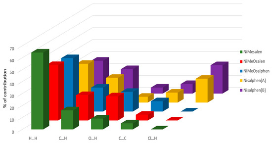 Figure 11 shows the contributions of contacts obtained from the decomposition of the fingerprint plots. The fingerprint plots of NiMesalen, NiMeOsalen, and NiMeOsalphen were similar, indicating that the H∙∙∙H and C∙∙∙H/H∙∙∙C were the most important contributors for crystal packing. H∙∙∙H contacts contributed 64.4% (NiMesalen), 46.4% (NiMeOsalen), and 32.4% (NiMeOsalphen), while C∙∙∙H/H∙∙∙C contacts contributed 16% (NiMesalen), 21.2% (NiMeOsalen), and 20% (NiMeOsalphen). A similar trend was observed in the fingerprint plot for Nisalphen, where the H∙∙∙H and X∙∙∙H/H∙∙∙X contacts had greater contributors for stabilizing interactions, with H∙∙∙H contacts contributing 32.5% and 27.5% in molecules A and B, respectively. The contributions for C∙∙∙H/H∙∙∙C, O∙∙∙H, and C∙∙∙C contacts were approximately of 20%, 5%, and 8% for molecules A and B, while the Cl∙∙∙H/H∙∙∙Cl contact contributed 19.9% and 23.8% in molecules A and B, respectively.