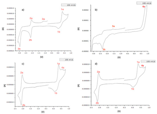 We performed voltammetry of the ligands (Figure 12b). The salen ligand ran in the direction of the positive potential in an interval of −3.2 to 1.0 V. In an inversion study, reduction signals 3a and 3b were associated with C=N reduction and an irreversible oxidation signal, 4a [58]. Figure 12a shows the Nisalen voltammogram under the same condition, caused by the nickel oxidation process ([NiIIL] → [NiIIIL ] + 1 ē) and 2a and 2b due to nickel reduction process ([NiIIL] + 1 ē → [NiIL]) [14,59]. Signal 3a and 3b was also observed to shift lower potential values. The other NiRsalen complexes showed a similar behavior with the signals that shifted to different potentials due to the substituent in the 5,5′position (Figures S40–S46, Supplementary Materials). In this work, only the processes associated with the reduction and oxidation of nickel were reported. The voltammograms were run in an interval of −2.4 to 1.0 V (Figure 12c,d).