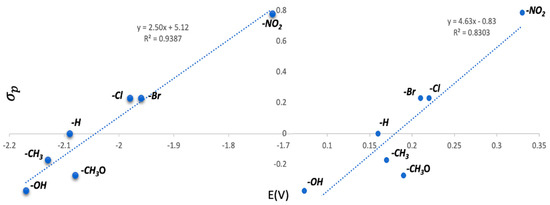 For both processes, we found a trend between E1/2 and the effect of the substituent. Correlations were made with the Hammett sigma in the para-position. The metal center’s acidity was influenced by the effect of the substituent. Therefore, the oxidative and reductive capacity of nickel modulated with the correct use of these substituents [13,61,62,63]. Electron-donor substituents shifted the E1/2 to a lower potential value and the electron-withdrawn groups shifted toward a more positive potential value. Thus, an electron-donor group improved the reductive capacity and electron-withdrawn groups improved the oxidative capacity of nickel, as shown in Figure 13.