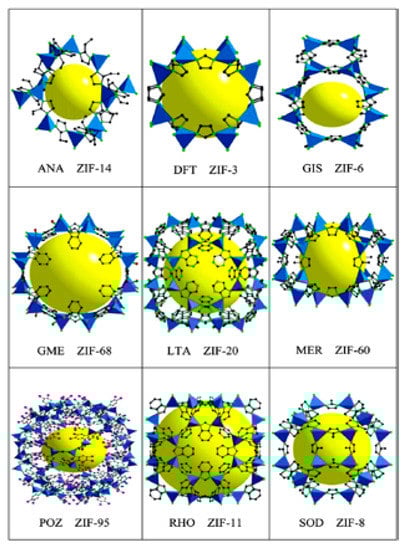 In particular, zeolite-like frameworks or zeolitic imidazolate frameworks (ZIFs) with structures similar to conventional aluminosilicate zeolites are distinguished from other numerous metal–organic frameworks. ZIFs networks with the prototypical zeolite four-connected topology (e.g., SOD, RHO, LTA, etc.) are built of imidazolate linkers with various functional substituents and metal bivalent ions. ZIF structures are built of M(im)4 (im = imidazolate) tetrahedra constructed by the coordination between M2+ cations and im anions, where im units constitute the bridges connecting the metal centers [31,32]. The bonding angle formed by imidazolates when bridging transition metals (M-im-M) is close to the Si-O-Si bond angle (145°) in zeolites, which gives rise to many different ZIF networks with zeolite-like topological structures [33]. The representative ZIF matrices with zeolitic structures are shown in Figure 1. Their numerous fascinating properties provide potential utilization in a broad range of applications including gas capture and separation, sensing, catalysis, electronic devices and drug delivery [34].