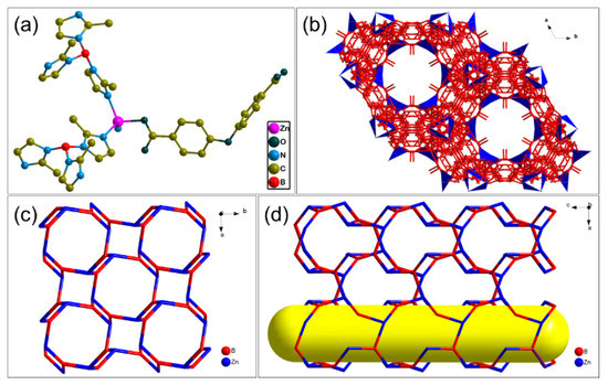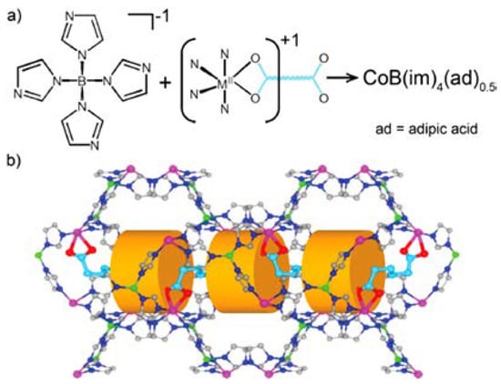 An appropriate usage of the mixed linker approach involving using pre-synthesized boron imidazolate linkers in a combination with polycarboxylate ligands for the construction of the BIF materials may result in the pore partition for a number of structures. In particular, replacing a chelating ligand such as acetate by a bridging dicarboxylate ligand results in cross-linking of one linker with each other via metal coordination centers. In turn, it results in the pore space partition in the zeolitic network (Figure 2) [42,58]. Thus, this approach results in generating pore space partition in zeolitic boron imidazolate frameworks via adding surplus linkers.
