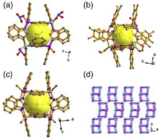(a) The cubic cage in the BIF-26 framework. (b) The cubic cage in the BIF-27 framework. (c) The cubic cage in the BIF-58 framework. (d) The packing of cages in the BIF-27 framework. Color codes: Zn, pale blue; Co, lavender; B, purple; O, red; C, gray; N, blue. Partial H atoms are omitted for clarity. Reprinted with permission from [44].