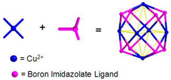 In particular, the solubility properties allow one to use MOC structures for the construction of BIF materials under solvothermal synthesis conditions involving generally heating of the reagent’s solution. Note that the common strategy for the BIFs synthesis involves using the pre-synthesized BIm4 and HBim3 linkers. Therefore, the possible complications arising from side reactions because of B–H bond lability in HBim3 linkers could prevent the appropriate BIF structure construction. Using pre-synthesized MOCs as building blocks may prevent this hindrance. This strategy involves self-assembly of discrete metal boron imidazolate cages comprising tetradentate boron imidazolate ligands in two-dimensional BIF frameworks. However, despite this approach efficiency, there are only limited examples of its use for the BIF construction. An example is the formation of zeolite type BIF matrices with a or b cage substructures prepared using a cubic cage (M4L4) and two dodecahedral cages (M6L8) with Zn2+ and Cu2+ ions (L = imidazolate ligand) according to cage self-assembly [44]. The principle of self-assembly of the dodecahedral cage (M6L8) is shown in Figure 4 [45].