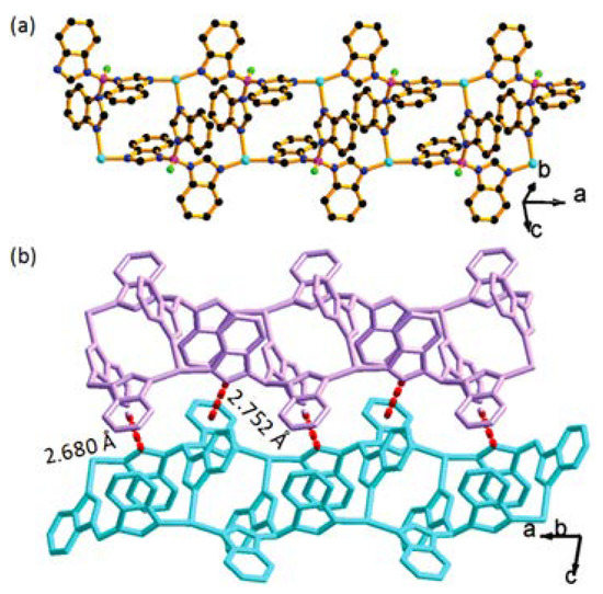 (a) View of the ladder-like chain in BIF-40; and (b) the packing view between chains in BIF-40, showing the C–H⋯π interactions (red dashedline) between the adjacent chains. Color codes: Cu, pale blue; B, purple; C, black; N, blue; H, green. Partial H atoms are omitted for clarity. Reprinted with permission from [43].