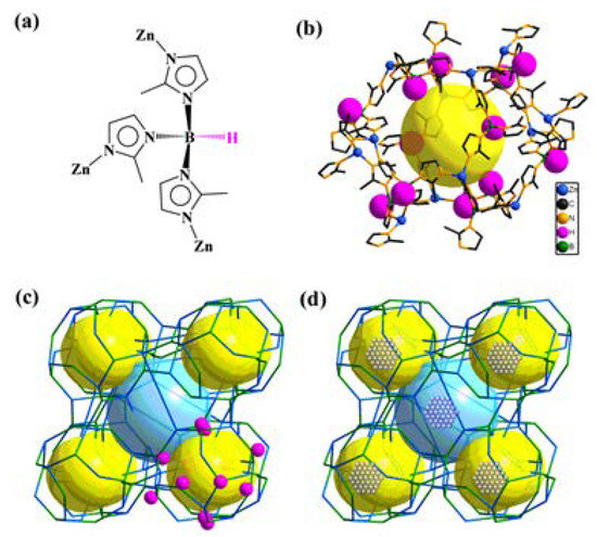 An example of a self-assembly of Zn2+ boron imidazolate cages in a combination with inorganic I- anions is the formation of the porous BIF-33 framework [44]. For this purpose, the following discrete structures of cages were utilized: (1) three coordination sites of tetrahedral Zn centers were coordinated by the boron imidazolate ligands, while the fourth one was linked with a special anion or guest molecule; and (2) the isolated M6L8 cages were linked by a bridging linker I−. Thus, these cubic cages may be assembled in the high-dimensional porous frameworks by particular linkers connecting the Zn2+ nodes.