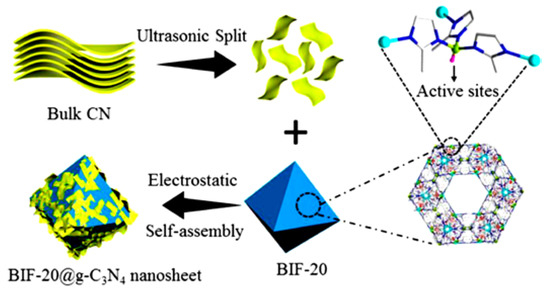 - Xu, G.; Zhang, H.; Wei, J.; Zhang, H.-X.; Wu, X.; Li, Y.; Li, C.; Zhang, J.; Ye, J. Integrating the g-C3N4 Nanosheet with B-H Bonding Decorated Metal−Organic Framework for CO2 Activation and Photoreduction. ACS Nano 2018, 12, 5333–5340. [Google Scholar] [CrossRef]