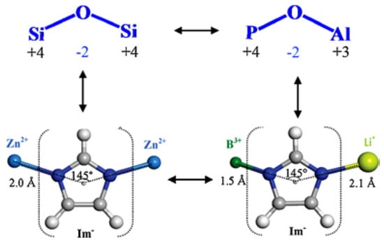In relation with the archetypic zeolite structure, to construct ZIFs, a typical strategy is the use of divalent metal cations (Zn2+ in particular) and imidazolate ligands (Im) with different substituents to replace Si4+ (Al3+) and O2− in zeolites, respectively [38]. Similar to how Al3+ and P5+ in microporous AlPO4 matrices formally replace Si4+ in SiO2 units of classical zeolites, so do M+ and M2+ and B3+ nodes in BIF networks replace M2+ (M = Zn, Cd, Co, etc.) in ZIF structures [15,37] (Scheme 1).