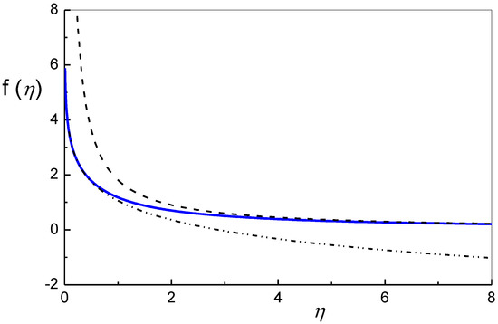 where η=L/Re. The f(η) function is logarithmic at small L values and hyperbolic at large L values. The explicit form of f(η) is given in Equations (A6) to (A8) in Reference [2] and is shown in Figure 1. The figure shows f(η) as a solid blue line, and the logarithmic and hyperbolic components are shown as dash-dot-dot and dashed lines, respectively.