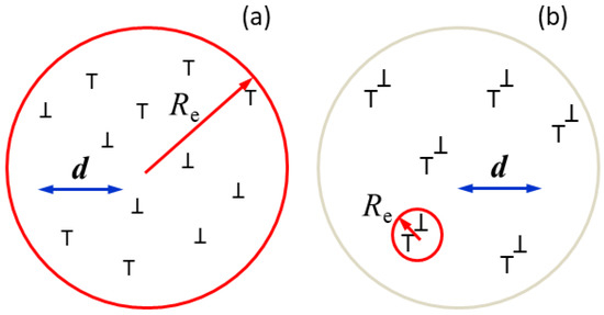 Krivoglaz and coworkers [20,21] showed that the Fourier transform of the strain profile is a logarithmic function of K as long as D/L is larger than unity, where D is a number of length dimensions. In References [20,21] D was suggested to be the grain size. The problem with this definition of D is the same as in the elastic stored energy of dislocations, which becomes logarithmically singular if the upper integration limit is set to be the crystal size. In the case of elastic stored energy, this problem is solved by setting the upper integration limit by the average distance of dislocations [37,38]. Wilkens realized the correlation between the elastic stored energy of dislocations and strain broadening of diffraction peaks, and replaced D in the Krivoglaz formula with the effective outer cut-off radius of dislocations, Re [2,3,39]. Wilkens introduced the concept of “restrictedly random” dislocation distributions and calculated the strain function, f(η), in the entire L range [3]. The concept assumes that the equal number of plus and minus straight parallel screw dislocations are randomly distributed within cylinders of Re radii, where the cylinders cover the whole crystal. Since the value of Re depends on the actual dislocation density, Wilkens introduced the dimensionless parameter M = Re to describe the dislocation arrangements [3]. The value of M is large when the dislocations are uncorrelated and arranged randomly and the related strain fields are of long-range character. In contrast, M is small when opposite-sign dislocations are in strong correlation close to each other and the related strain fields, due to screening, are of short-range character. An intuitive schematic illustration is shown in in Figure 2, where 12 dislocations are randomly distributed in Figure 2a and in a strong dipole configuration in Figure 2b. In the case of random distribution, the strain fields reach out much further than the average dislocation distance, ddisloc, (the red circle is Re and the blue double arrow the average dislocation distance), whereas in the case of strong dipole configuration, the strain fields are strongly screened and Re becomes shorter than ddisloc. The M value is in direct correlation with the average dislocation distance: