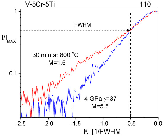 Intensity distributions of the {110} reflections of a V-5Cr-5Ti alloy deformed by high-pressure torsion at 4 GPa pressure to the shear strain of γ = 37 (red curve) and after heating to 800 °C (blue curve) with logarithmic intensity scale normalized to the maximum intensities and the FWHM. More details about material processing and the heat treatments can be found in Reference [40].