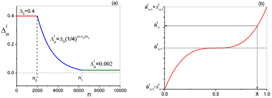 (a) Half-breadth of the parameter interval, , as a function of the number of iterations, n. Up to the first no steps (horizontal red line), stays constant. Between the steps no and n1, decays exponentially (blue line). Beyond n1, stays constant (horizontal green line). (b) Schematic drawing of the parameter values vs. the random generated number, , in the biased cubic probability function used in the special MC algorithm.