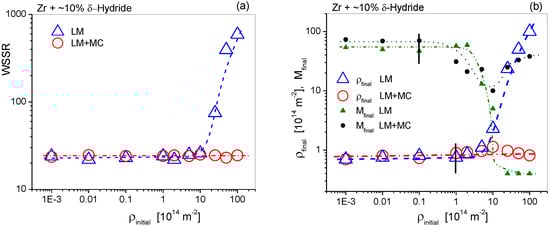 Though the LM optimization procedure is a well-established and widely used analytical method, in nonlinear problems, the parameter space can have more than a single minimum and LM can get stuck in one which is not the absolute minimum. The implementation of the MC procedure combined with LM aimed to find the global minimum in the parameter space. A systematic analysis was carried out to check the performance of both the LM procedure alone and the combined alternative with LM plus MC. The most critical parameters were the dislocation density concomitant with the dipole character number, i.e., ρ and M. One of the Zircaloy-4 X-ray diffraction patterns containing about 10% δ-hydride, discussed in detail in the next paragraph, was evaluated by varying the starting values of ρ over 5 orders of magnitude, from 10−3 × 1014 m−2 to 100 × 1014 m−2. The results are shown in Figure 5. CMWP is governed by optimizing the parameters for obtaining the smallest weighted sum of squared residuals (WSSR). The WSSR values are shown in Figure 5a vs. the starting values of ρ when LM alone (open blue triangles) and LM combined with MC (open red circles) were applied. The figure shows that LM alone could not find the minimum of WSSR, especially when the initial ρ values were larger than the optimum, which was about 0.9(± 0.1) × 1014 m−2. The combined application of LM + MC always found the optimum WSSR whatever the initial values of ρ were. The dislocation density and the dipole character number, ρ and M, are shown vs. the initial ρ values in Figure 5b. The figure shows that both ρ and M varied up to about two orders of magnitude when only LM was applied: 0.7 ≤ ρ≤ 100×1014 m−2, 0.4 ≤ M ≤ 60. With the combination of LM + MC, the optima of both ρ and M were found within reasonable error margins: 0.7 ≤ ρ ≤ 1.13 × 1014 m−2, 10 ≤ M ≤ 60. The relatively large variation of M does not mean that it could not be determined. Whenever the value of M is of the order of 10 or larger, it only means that the dipole character of dislocations is very weak. Or, in other words, the dislocation arrangement is “random” [2,3].
