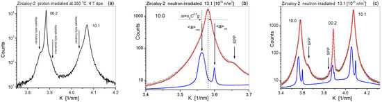 (a) Typical satellites in the lower intensity ranges of diffraction peaks in a proton irradiated Zircaloy-2 specimen. The vertical arrows point to the satellite peaks produced either by vacancy- (on the left side of the peaks) or interstitial-type dislocation loops (on the right side of the 00.2 reflection). The interstitial-type satellite peak is blending in with the broader 10.1 Bragg peak. (b) Measured (open circles) and CMWP-calculated (red line) zoomed part of the diffraction pattern of a Zircaloy-2 cladding material specimen [58] neutron irradiated to 13.1 × 1025 n/m2. The blue line shows the satellite peak related to vacancy- and interstitial-type dislocation loops. (c) The same as in (a) for the first three Zr peaks. The alloy contains second-phase particles (SPPs) of different precipitates, as indicated in the (b) and (c) figures.