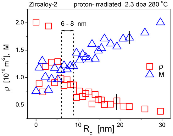 A systematic investigation of the effect of Rc on the physical parameters is shown in Figure 7. We carried out this analysis on the diffraction pattern of a Zircaloy-2 specimen proton-irradiated to 2.3 dpa at 280 °C, in which the dislocation density was very large and the M parameter about unity [68]. The figure shows ρ and M vs. Rc in the range of 0 < Rc < 30 nm. With Rc decreasing to about Rc ≅ 8 nm, M decreased, whereas ρ increased. Below Rc ≅ 8 nm, there was a range of Rc between about 6 ≤ Rc ≤ 8 nm in which both ρ and M were stable around ρ ≅ 9 × 1015 m−2 and M ≅ 0.75. The introduction of Rc in the range of about 6 to 8 nm stabilized the physical parameters, especially the values of ρ and M. When Re is significantly larger than Rc, then its value has no effect on the physical parameters.