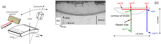 A hydride blister was grown on a Zircaloy-4 alloy platelet sectioned from a CANDU pressure tube. The alloy composition was Zr-1.49%Sn-0.2%Fe-0.11%Cr-2.5%Nb, all in wt %. [71]. For the hydration procedure, see References [70,72]. The schematic configuration of the hydrated platelet within the pressure tube, along with an optical micrograph of the hydrated blister, is shown in Figure 8a,b. High-angular-resolution X-ray microdiffraction was carried out at the 1-ID beamline at the Advanced Photon Source synchrotron at the Argonne National Laboratory [71]. The schematic positions of the X-ray diffraction experiments on the hydrated platelet are shown in Figure 8c. X-ray diffraction scans were taken along three linear traces, one horizontal (red line) and two vertical (center green line and right blues line), with 16 and two times 11 positions, respectively. The beam size on the specimen was 300 × 300 μm2, illustrated approximately by the small red dot in the center vertical line in Figure 8c.
