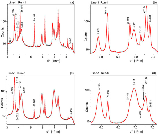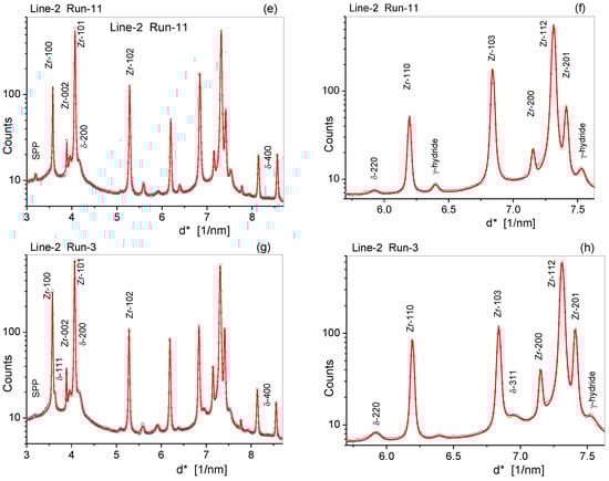 The diffraction patterns were evaluated for the dislocation density, the subgrain size, the dislocation arrangement parameter, and the stacking fault density, ρ, <x>area, M, and β in the fcc δ−ZrH and in the Zr matrix phases. Typical measured (open circles) and fitted (red solid lines) diffraction patterns corresponding to four different positions along the scanning lines are shown in Figure 9. In order to show the different reflections of very different relative heights, the intensities are in logarithmic scale. The patterns in Figure 9a,c,e,g show the entire measured range for the positions Line-1 Run-1, Line-1 Run-8, Line-2 Run-3, and Line-3 Run-11, respectively. Figure 9b,d,f,h shows zoomed ranges from 5.5 to 7.5 degrees, showing the detailed structure of the patterns where relatively large number of diffraction peaks were in complicated sequences and overlapped.