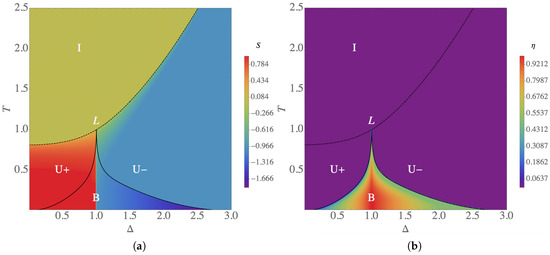 Phase diagram at zero field, in the plane. The color code shows the behavior of (a) the uniaxial order parameter S, which is zero in the high-temperature isotropic phase (I), and (b) the biaxial order parameter , which is nonzero only in the low-temperature biaxial (B) phase. Notice that at low and intermediate temperatures the value of S associated with the smallest equilibrium value of changes sign along the line on which the Landau point is located. Solid (dashed) lines indicate continuous (first-order) transitions. The calamitic (U+) and discotic (U−) uniaxial phases are also indicated.