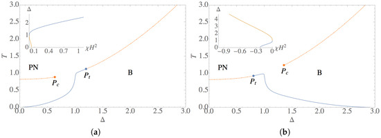 Main plots: Phase diagrams in the presence of a field of intensity , with the choice and , both for (a) and (b). The Landau point is replaced by a simple critical point and a tricritical point . The regions corresponding to the paranematic (PN) and the biaxial (B) phases are also indicated. Insets: Dependence of the values of at (orange curve) and (blue curve) on the product . Apart from small shifts produced by the field, a combined parametric plot obtained from the values of T and at and as is varied would closely follow the first-order lines in Figure 1.