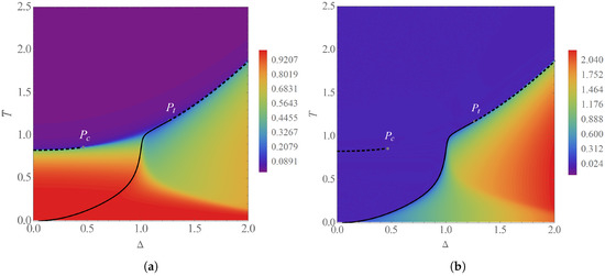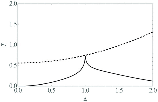the solution of which defines a line of Landau points corresponding to a varying chemical potential. For , we recover the result obtained at zero field in Equation (19). As is reduced, the temperature corresponding to the solution of Equation (38) is also reduced, as it can be checked by calculating the implicit derivative of with respect to from Equation (38).