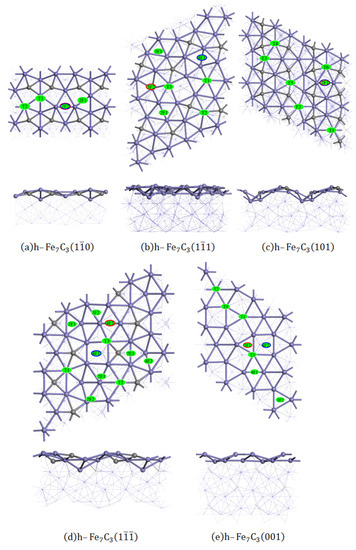 - The Miller index of the symmetric crystal plane can be obtained from calculating the intercept with the plane equation. Besides, the stability of the crystal plane is measured by the surface energy, as shown in Equation (6):where En is the total energy of the n-layer crystal plane, Ebulk is the energy of a single-layer unit cell, n is the number of layers of unit cell and A is the area of the crystal plane. The smaller the surface energy, the more stable the crystal plane will be [15]. The adsorption of CO on h-Fe7C3 is expressed by its adsorption energy:where ECO/slab represents the energy adsorbed by CO on the crystal plane, Eslab is the energy of the crystal plane and ECO is the energy of free CO. The more negative the adsorption energy, the more stable the adsorption of CO on the crystal plane will be.