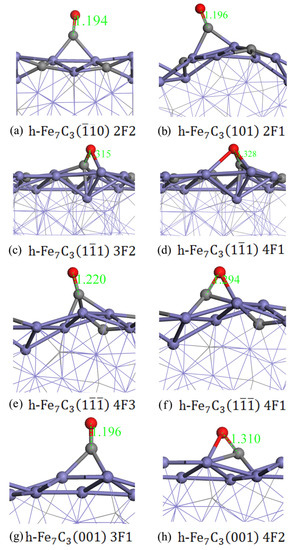 The most stable and active adsorption configuration of CO on various crystal planes of h-Fe7C3 (bond length given in Å) (a. 2F2; b. 2F1; c. 3F2; d. 4F1; e. 4F3; f. 4F1; g. 3F1; h. 4F2).