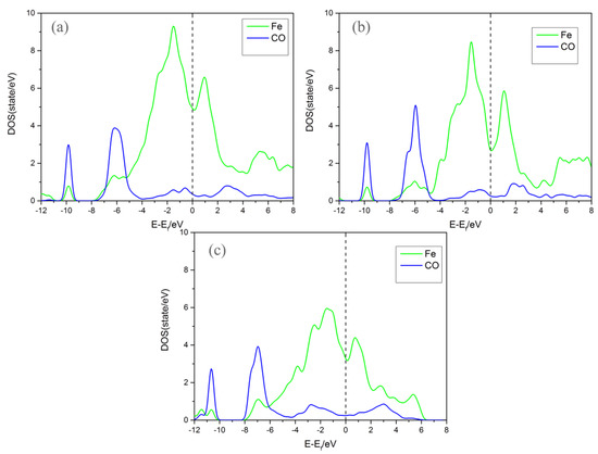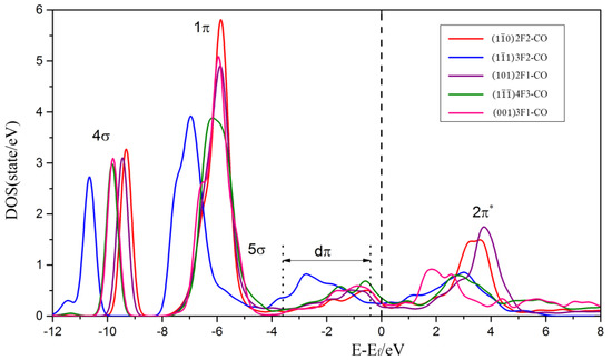 By combining Figure 2 and Table 3, it can be seen that the point positions with large adsorption energy are all around a specific Fe atom, such as 2F2 and T2 on ; T3, 3F2 and 4F1 on ; T1 and 2F1 on ; 2F1 and 4F3 on ; and 3F1 on . The adsorption energies at these point positions are remarkably higher than other point positions on the same plane. This is because these Fe atoms are in the C-deficient position on the crystal plane, which makes it easier for them to adsorb CO.
