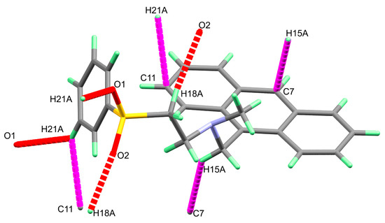 The intermolecular C-H...π (magenta) and O...H (red) contacts in the crystal structure of 3.