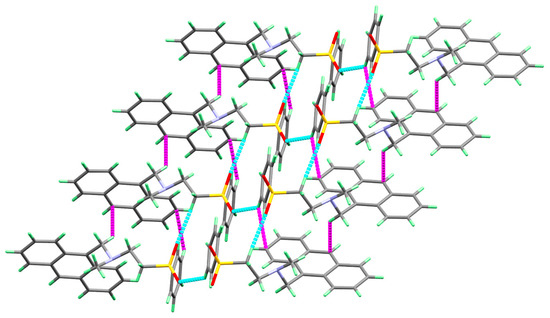 Molecular packing of molecule 3 via C-H...π (magenta) and O...H (red) interactions.