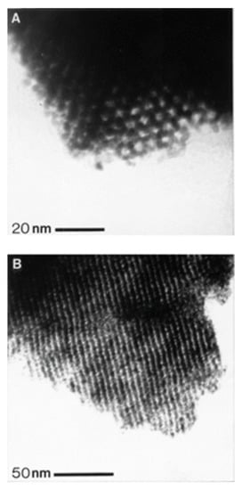 Transmission electron micrographs showing the (A) end view and (B) side view, of the pores. The photos are of a hexagonal liquid crystalline solution containing 42 weight% of a non-ionic surfactant octaethyleneglycol monohexadecyl ether, 29 weight% water, and 29 weight% hexachloroplatinic acid hydrate. Reprinted with permission from Attard et al. Science 1997, 278, 838–840.