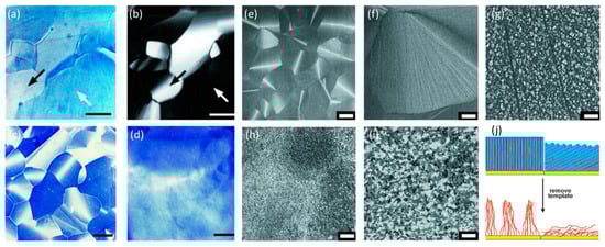 Conducting polymers are useful in organic electronic devices due to their stability, mechanical properties, and ease of processing. However, the degree of disorder of the polymer affects their performance. Molecular ordering improves carrier mobility and enhances charge injection. To achieve an improvement in performance, Hulvat et al., prepared conducting polymer films in a liquid crystal template []. They formed the films of a conducting polymer poly (3,4-ethyldioxythiophene), PEDOT, by electropolymerisation within a liquid crystalline template. Figure 5 shows the polarising optical microscopy and SEM images of PEDOT in the liquid crystal template, presenting its optical properties and the nature of the LC domains on the substrate. In Hulvat’s approach, the polymerisation was carried out in the hydrophobic domain of the hexagonal lyotropic liquid crystal phase. This allowed the use of less polar but more useful monomers, such as 3,4-ethyldioxythiophene (EDOT) and bithiophene [,]. The polymers formed within the template provided an ease of processing since the nanoscale distribution of monomers in the LCs was locked-in during polymerisation. The incorporation of bulky substituents to solubilise the polymer was also avoided, simplifying the preparation and improving the electronic properties.