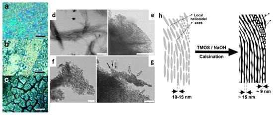 Cellulose is an abundant biopolymer found in nature. The unique combination of mechanical support, flexibility, abundance and biocompatibility that the cellulose presents, promises extensive applications for this material. Duplicating complex templates available in nature via templating and with materials which are biodegradable is attractive. The first example of cellulose nanocrystal templating was reported in 2003 []. In this paper, Dujardin et al. mixed an aqueous cellulose nanocrystal suspension with a solution of prehydrolysed tetramethoxysilane (TMOS). Through evaporation-induced self-assembly (EISA), the liquid crystal phase of the cellulose nanocrystal rods acted like a template. Figure 6 shows polarising optical microscopy images of the dilute suspensions of cellulose nanorods after solvent evaporation, producing a nematic liquid crystalline phase. The removal of the cellulose nanorod template produced a birefringent silica replica that exhibited patterned mesoporosity with cylindrical pores of 15 nm in diameter and 10 nm in wall thickness. TEM micrographs of the cellulose liquid crystal gel showing large domains of tightly aligned nanorods and the close packing of the nanocrystal bundles of the nematic template is shown in Figure 6d–g. The authors mention that it was not possible to unequivocally demonstrate whether the natural tendency of cellulose nanorods to twist upon packing induces sufficient a local helical ordering of the rods to produce a chiral imprint in the mesostructure of the porous silica replica.