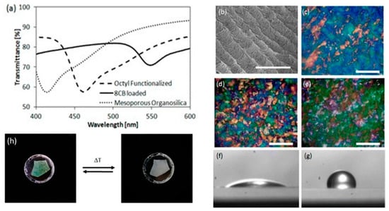 (a) UV−vis spectra of the mesoporous organosilica film, the octyl-functionalised organosilica film, and the octyl-functionalised organosilica film loaded with 8CB. (b) SEM image of the host material showing the characteristic left-handed twist of the layers (scale bar, 2 μm). (c–e) POM images of the mesoporous organosilica film, the octyl-functionalised organosilica film, and the 8CB loaded octyl-functionalised organosilica film, respectively, viewed under crossed polarisers (scale bar, 300 μm). Contact angle images of a drop of water on (f) the mesoporous organosilica and (g) the octyl-functionalised organosilica. (h) Thermochromic behaviour of the octyl-functionalised organosilica film loaded with 8CB, showing colour change from green to colourless upon heating to 48 °C. Reprinted with permission from Giese et al., ACS Appl. Mater. Interfaces 2013, 5, 6854–6859.