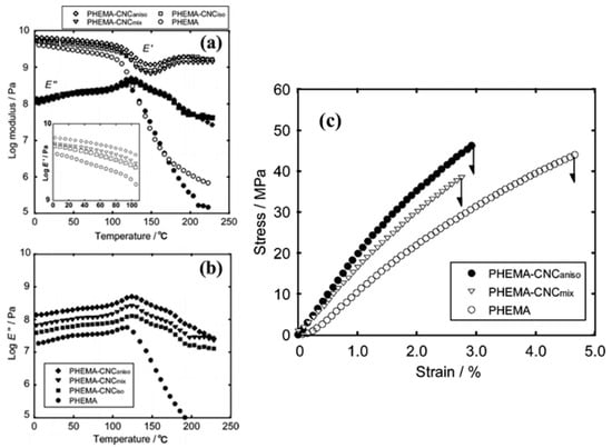 Tatsumi et al., reported the first hydrogels templated with cellulose nanocrystals in 2012 []. They prepared anisotropic poly (2-hydroxyethylmethacrylate) (PHEMA) and cellulose nanocrystal composite films. The film showed long-range chiral nematic ordering. The dynamic and mechanical testing of PHEMA samples showed that incorporating the cellulose nanocrystal (CNC) assemblies gives rise to an increase in the glass-state modulus of PHEMA. Figure 8 shows the temperature dependence of the storage modulus (E′) and loss modulus (E″), measured for the film samples of PHEMA. Three samples were compared by polymerising HEMA in different phases to give films of three polymer composites; PHEMA–CNCiso, PHEMA–CNCaniso and PHEMA–CNCmix for the isotropic phase, anisotropic phase and for the mixture of both, respectively. The data demonstrate the strengthening effect of the polymer matrix due to CNC dispersion. This was further confirmed by the tensile test which showed that the PHEMA–CNCaniso composite had the highest stiffness and strength of the tested samples.