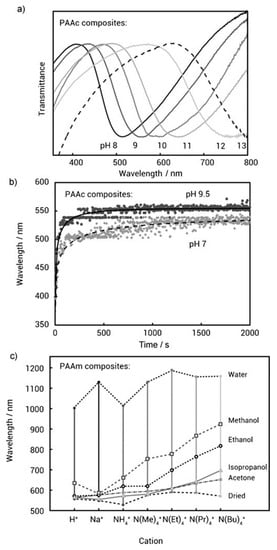 (a) Transmission spectra of the nanocomposite (50 wt% cellulose nanocrystal in different basic solutions showing a red shift with increasing pH. (b) Time dependence of the reflected colour from a nanocomposite (66 wt% cellulose nanocrystal) immersed in pH 7 and pH 9.5 aqueous solutions. (c) The maximum reflected wavelength of a cation-exchanged nanocomposite as a function of cation for dry, aqueous, and organic-solvent-swollen states. PAAm: polyacrylamide, PAAc: poly(acrylic acid). Reprinted with permission from Kelly et al., Angew. Chem. Int. Ed. 2013, 52, 8912–8916. Copyright (2013) American Chemical Society.